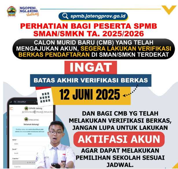 Selain verifikasi berkas, seluruh CMB yang sudah melakukan proses verifikasi juga wajib melakukan aktivasi akun melalui laman resmi PPDB Jawa Tengah di https://spmb.jatengprov.go.id/. Aktivasi akun sangat penting agar CMB dapat melanjutkan proses pemilihan sekolah sesuai jalur yang diinginkan.