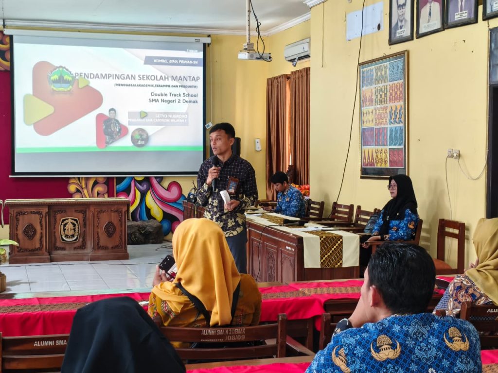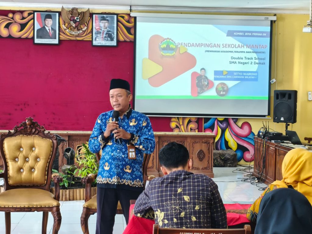 Demak – SMA Negeri 2 Demak terus berinovasi dalam meningkatkan kualitas pendidikan melalui program unggulan “Sekolah Mantap (Menguasai Akademik, Terampil, dan Produktif)” dengan sistem Double Track School. Program ini diperkuat melalui kegiatan pengarahan oleh Pengawas Cabang Dinas Pendidikan (Cabdisdik I), Bapak Setyo Nugroho, S.Pd., M.Pd., yang dihadiri oleh Kepala SMA Negeri 2 Demak, Khoirul Anwar, S.Pd., M.Pd., tim pengembang, serta perwakilan dari Bank Perekonomian Rakyat (BPR) BKK.